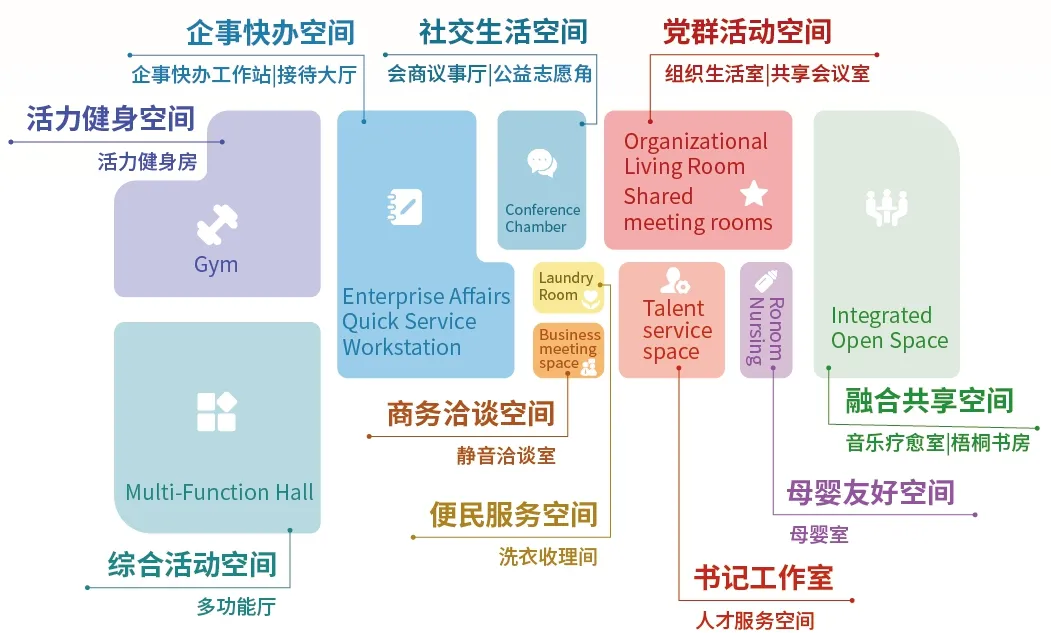 环贸党群服务中心设有党群活动、企事快办、书记工作室、商务洽谈、便民服务、活力健身、融合共享、社交生活、母婴友好、综合活动等十大功能空间,为楼宇党员群众提供集党建引领、服务赋能、交流互动于一体的综合性平台。
