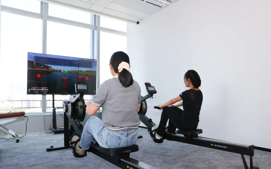 楼宇白领在健身室使用划船机